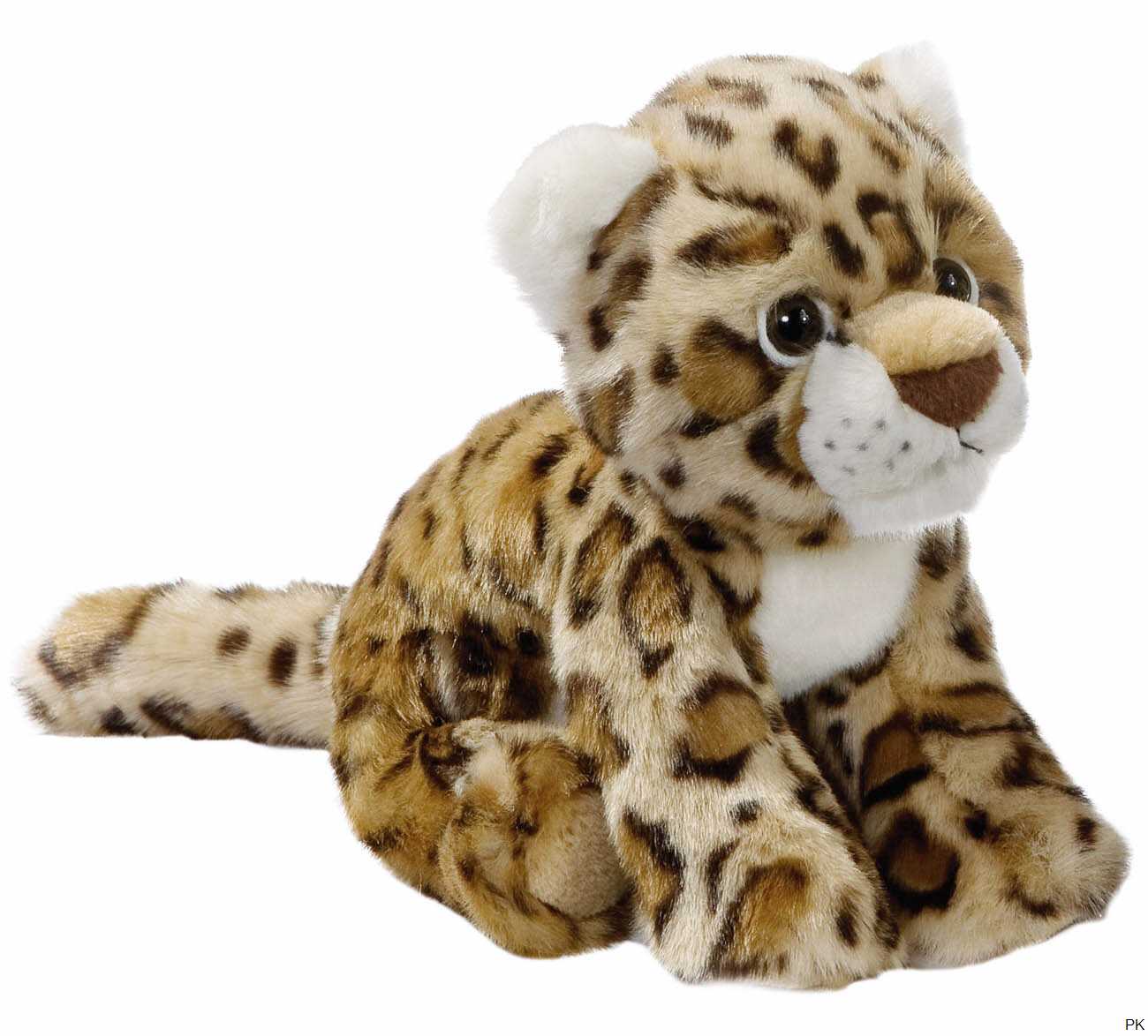 Das Stofftier Leopard in sitzender Position, mit brauner Schnauze.