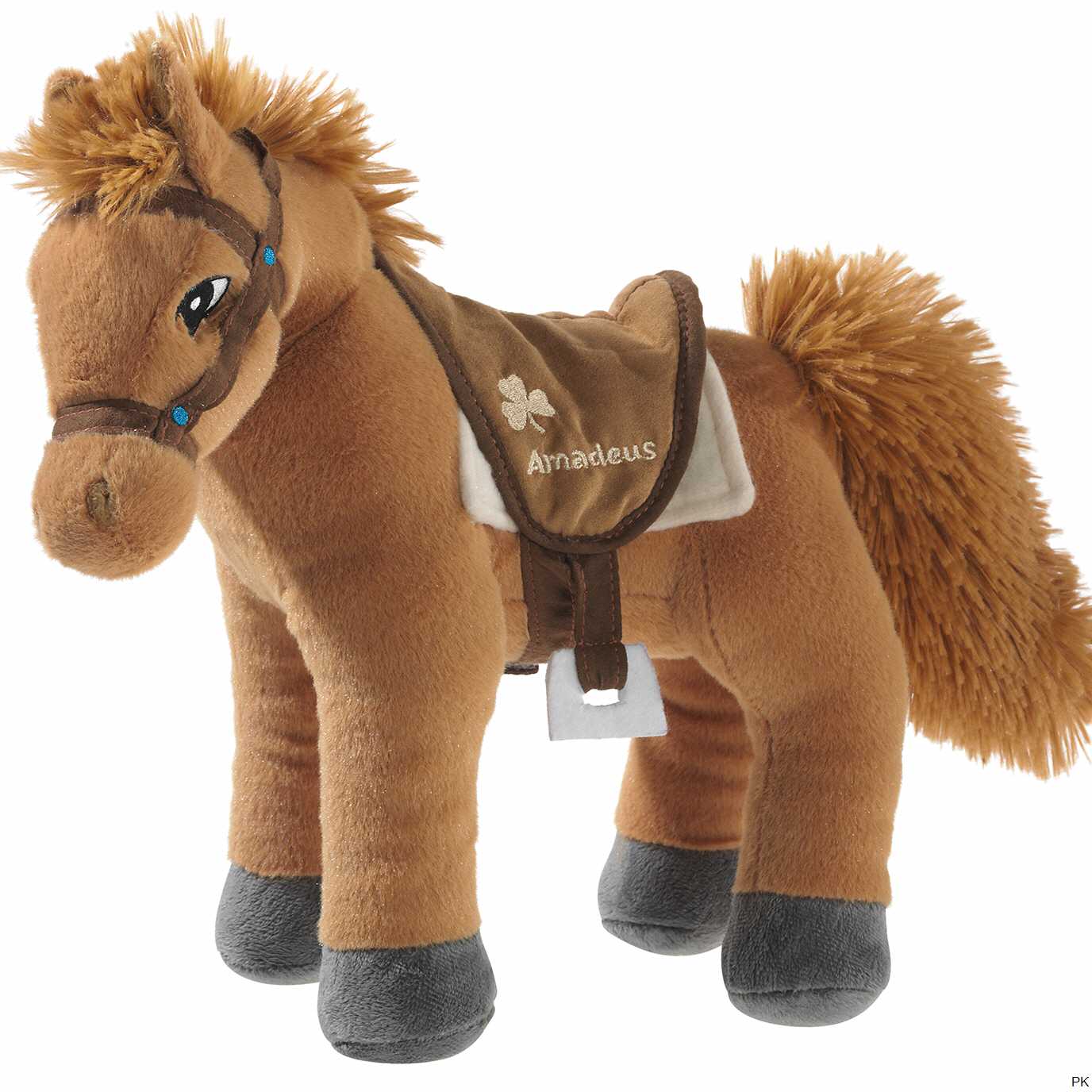 Das Plüsch Pferd Amadeus ist aus hochwertig verarbeitetem, kurzem Softwool-Material gefertigt. Das Plüschtier Pferd Amadeus hat eine braune Mähne und große, gestickte Augen. Sattel und Zaumzeug des Plüschpferds Amadeus sind bestickt. Das Kuscheltier Pferd Amadeus ist kuschelweich gefüllt.
