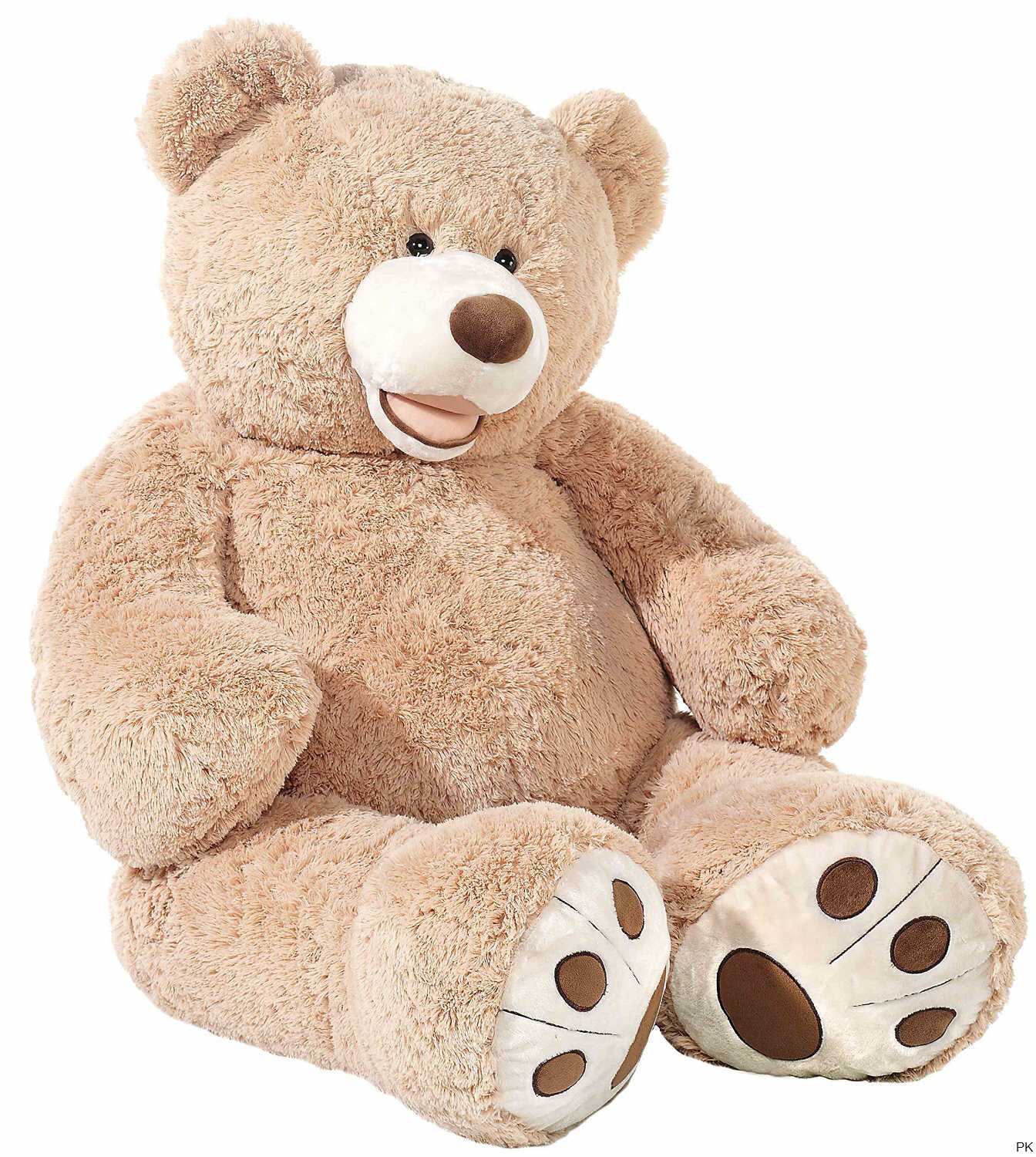Die Schnauze, die Innenohren und die Fußsohlen des XXL Teddybären sind mit Softwool-Material abgesetzt. Der große Teddy hat eine weiße Schnauze, eine braune Nase, schwarze Knopfaugen, ein offenes Maul und Bärentatzen.