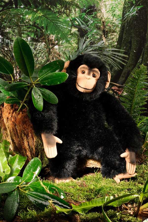 Das Kuscheltier Schimpanse ist hautsächlich schwarz gefärbt, das Gesicht, die Ohren und die Gliedmaßen sind farblich hell abgesetzt.