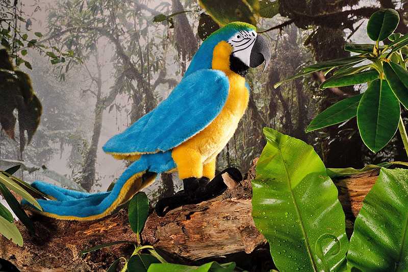 Das Stofftier Gelbbrustara hat eine gelbe Brust, der restliche Körper ist blau gefärbt. Der Kopf ist weiß, der Schopf grünlich gefärbt.