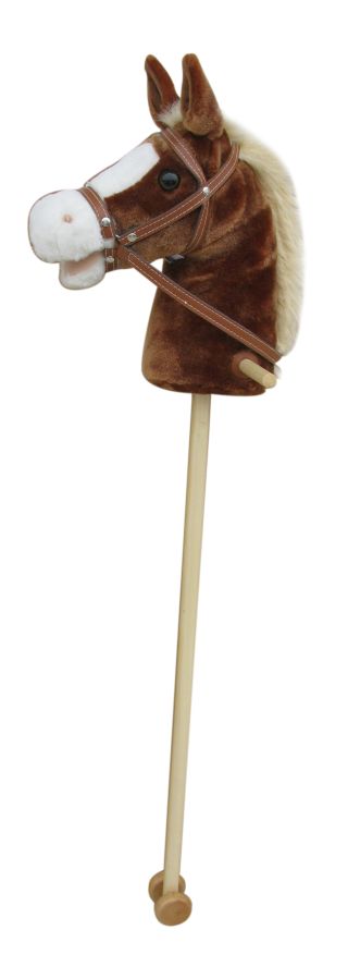 Plüsch Steckenpferd mit dunkelbraunem Kopf, cremefarbener Mähne, weißer Stirn und weißer Schnauze.