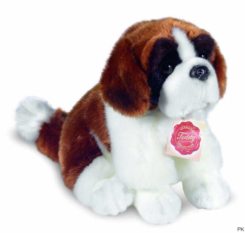 Das Plüschtier Bernhardiner von Teddy Hermann ist rückseitig braun gefärbt, bauchseitig, das Gesicht und das Schwanzende sind weiß gefärbt. Der Plüsch Bernhardiner hat eine schwarze Augenmaske, eine schwarze Nasenspitze und Knopfaugen.