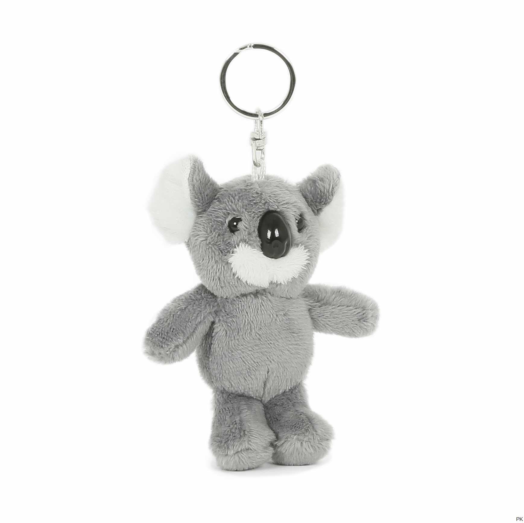 Schlüsselanhänger Koala aus kuschlig weichem Plüsch. Der Körper des Plüsch Koalas ist grau, die Innenohren weiß, Knopfaugen und Schnauze schwarz.
