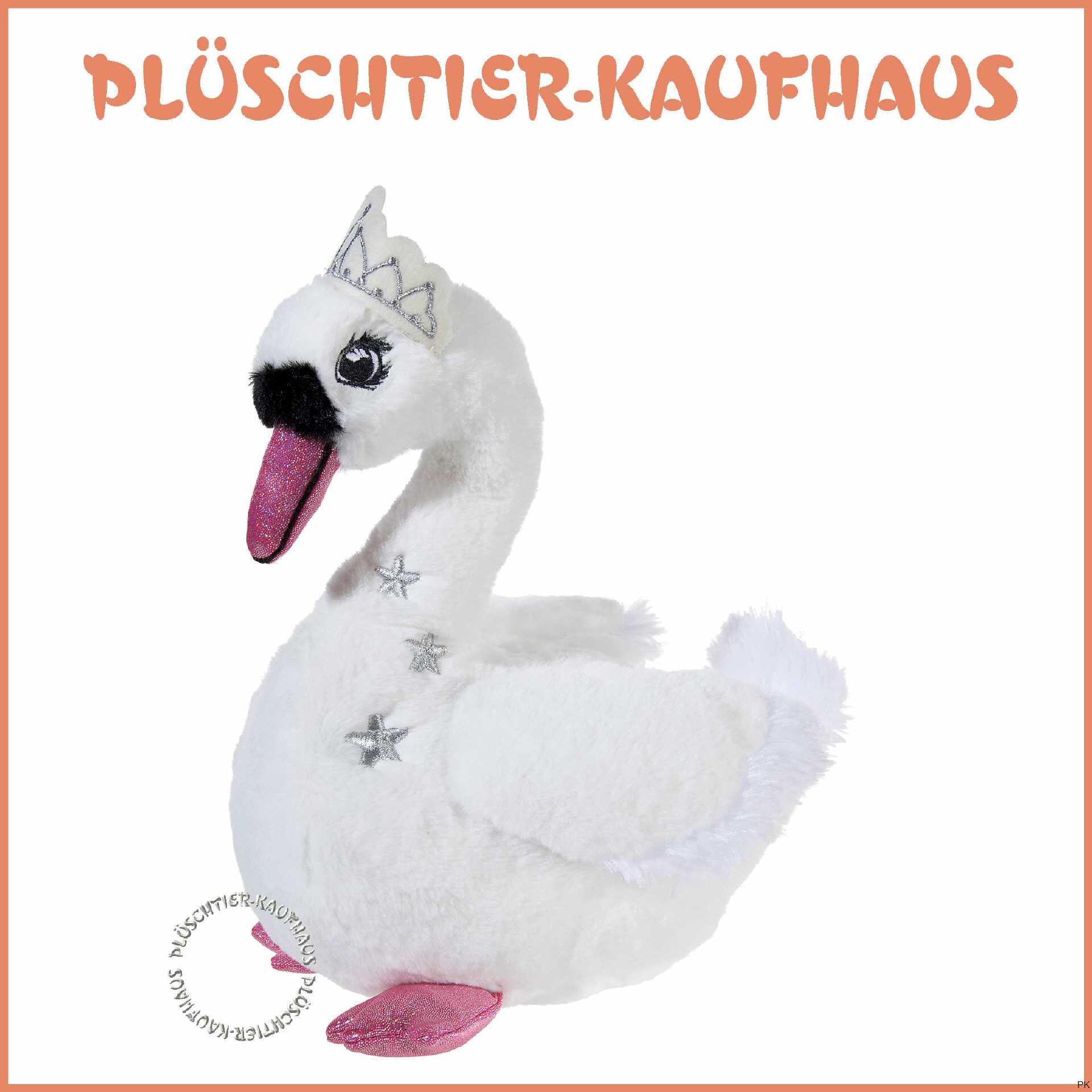 Das Plüschtier Schwan trägt eine glitzernde Krone und hat Sternchen und Pfötchen.