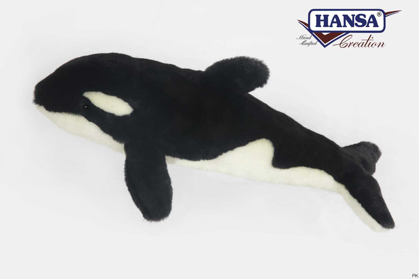 Das Plüschtier Wal ist an der Oberseite schwarz gefärbt, an der Unterseite weiß.