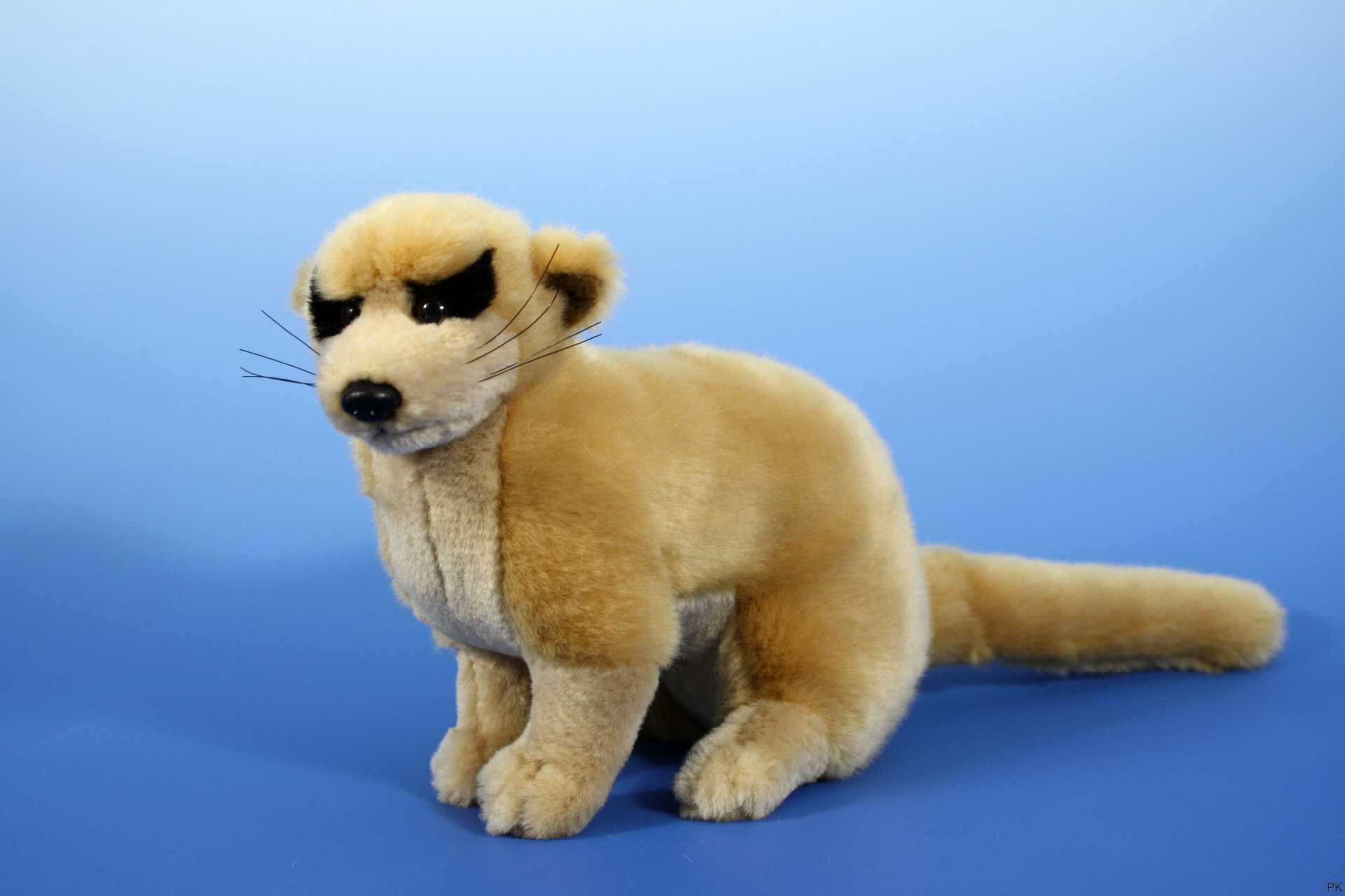 Das Stofftier Erdmännchen ist aus hochwertig verabeitetem, langflorigem Plüschmaterial hergestellt. Das Plüsch Erdmännchen ist rückseitig braun gefärbt, bauchseitig weiß. Das Kuscheltier Erdmännchen hat im Gesicht zwei schwarze Flecken um die Augen, die Nasenspitze und die Knopfaugen sind ebenfalls schwarz.