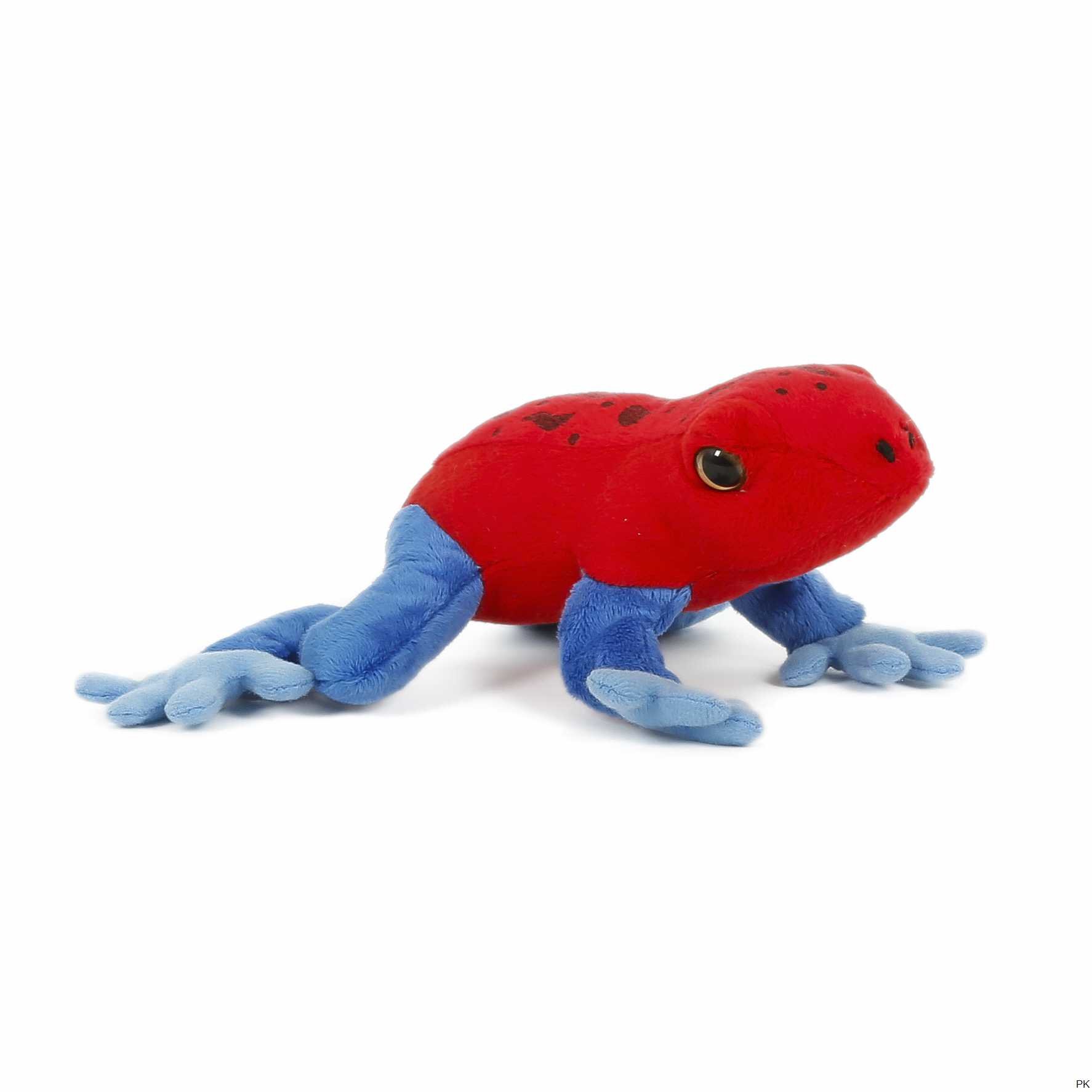 Das Stofftier Frosch ist aus kuschlig weichem Plüsch gefertigt, der Körper ist knallrot mit schwarzen Flecken, die Gliedmaßen sind blau gefärbt.