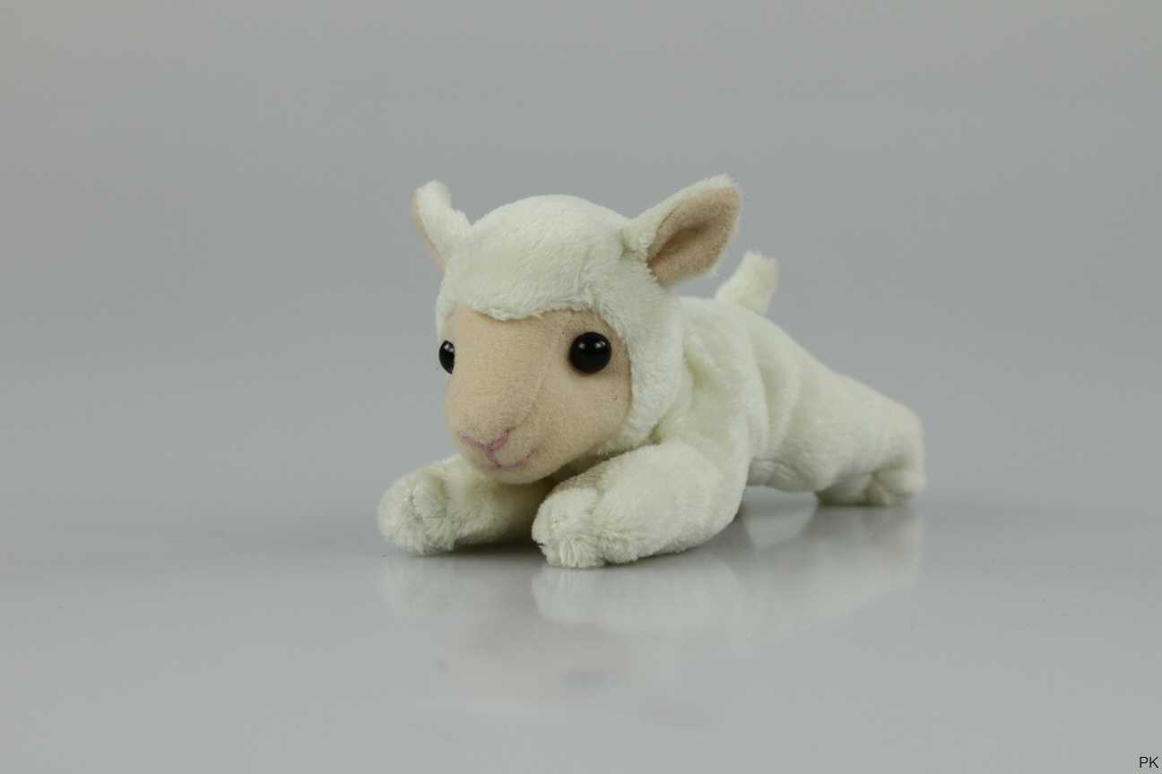 Das Stofftier Lamm ist aus hochwertig verarbeitem, kuschelweichem Plüschmaterial gefertigt. Das Plüsch Lamm ist weiß gefärbt, das Gesicht und die Innenohren sind beigefarben, die Knopfaugen schwarz.