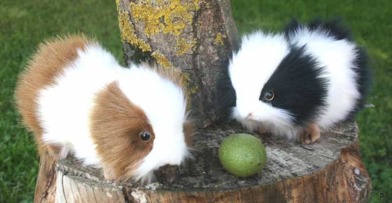 Das Fell des Kuscheltiers Meerschweinchen ist langfloorig, glänzend und flauschig, es verteilt sich auf den ganzen Körper. Beide Meerschweinchen sind zweifarbig gefärbt: braun/ weiß oder schwarz/ weiß.