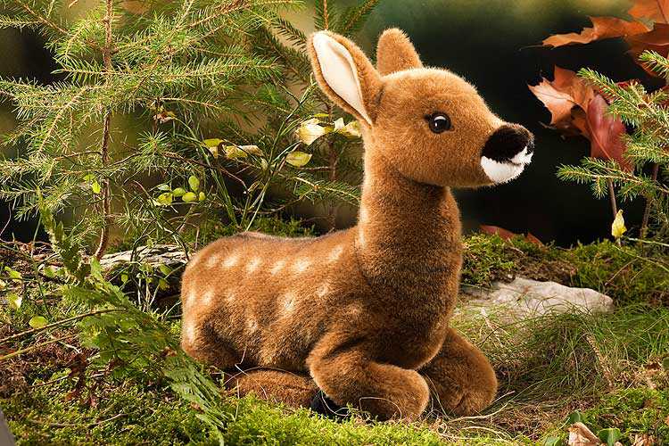 Das Stofftier Rehkitz ist braun mit weißen Flecken und Innenohren. Die Schnauze des Plüsch Rehkitz ist weiß, die Nasenspitze schwarz.