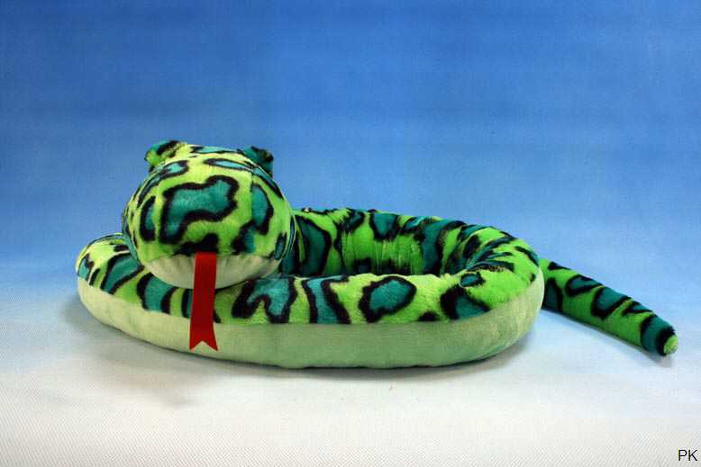 Plüschtier Schlange aus hochwertig verarbeitetem Plüschmaterial. Das Kuscheltier Schlange ist grün gefärbt, mit türkis/schwarzen Flecken.