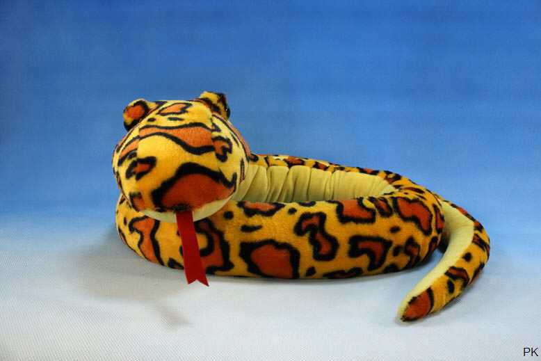 Plüschtier Schlange aus hochwertig verarbeitetem Plüschmaterial. Das Kuscheltier Schlange ist gelb gefärbt, mit braun/ schwarzen Flecken.