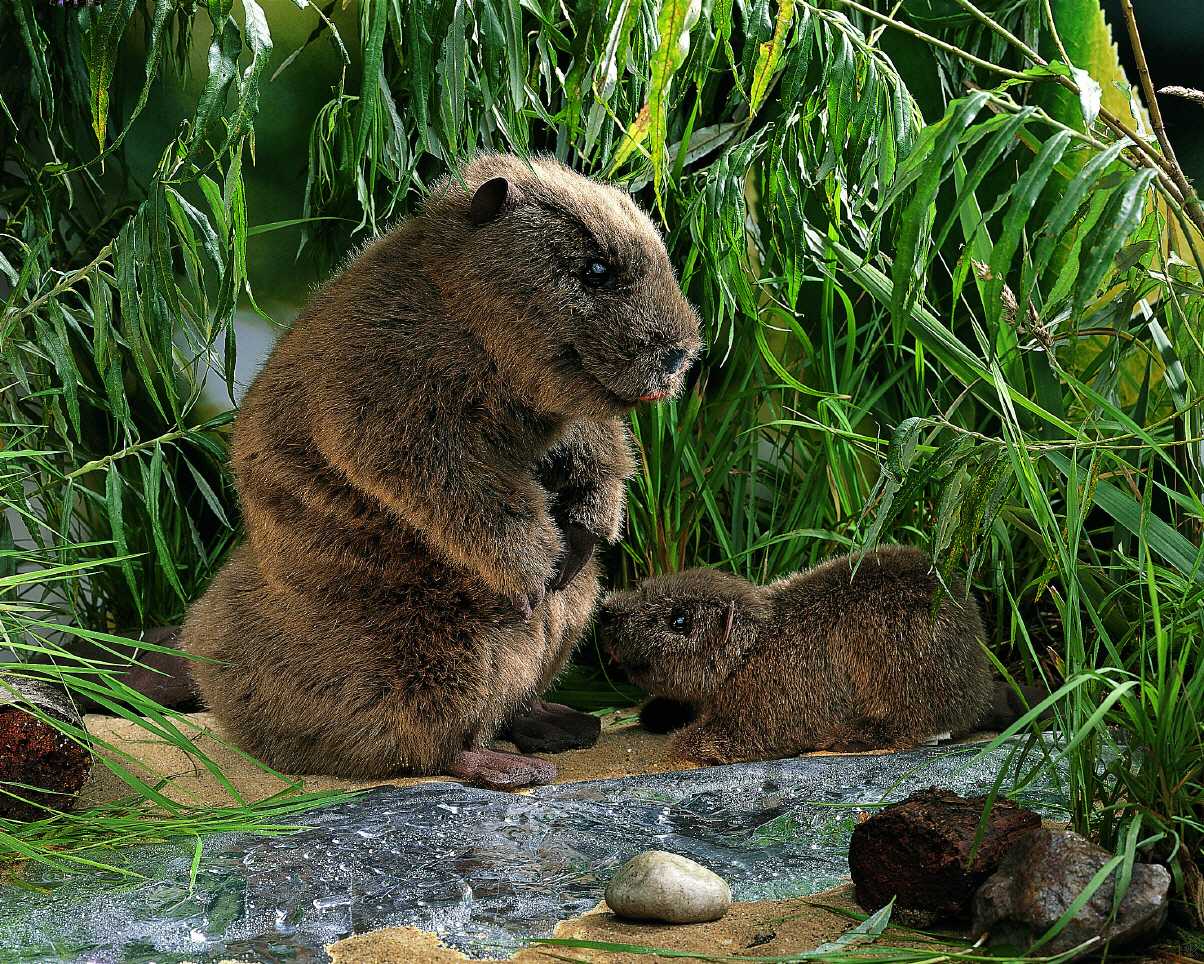Der Biber ist wie abgebildet in den zwei Varianten "sitzend" (34 cm groß) und "liegend" (26 cm groß) lieferbar.