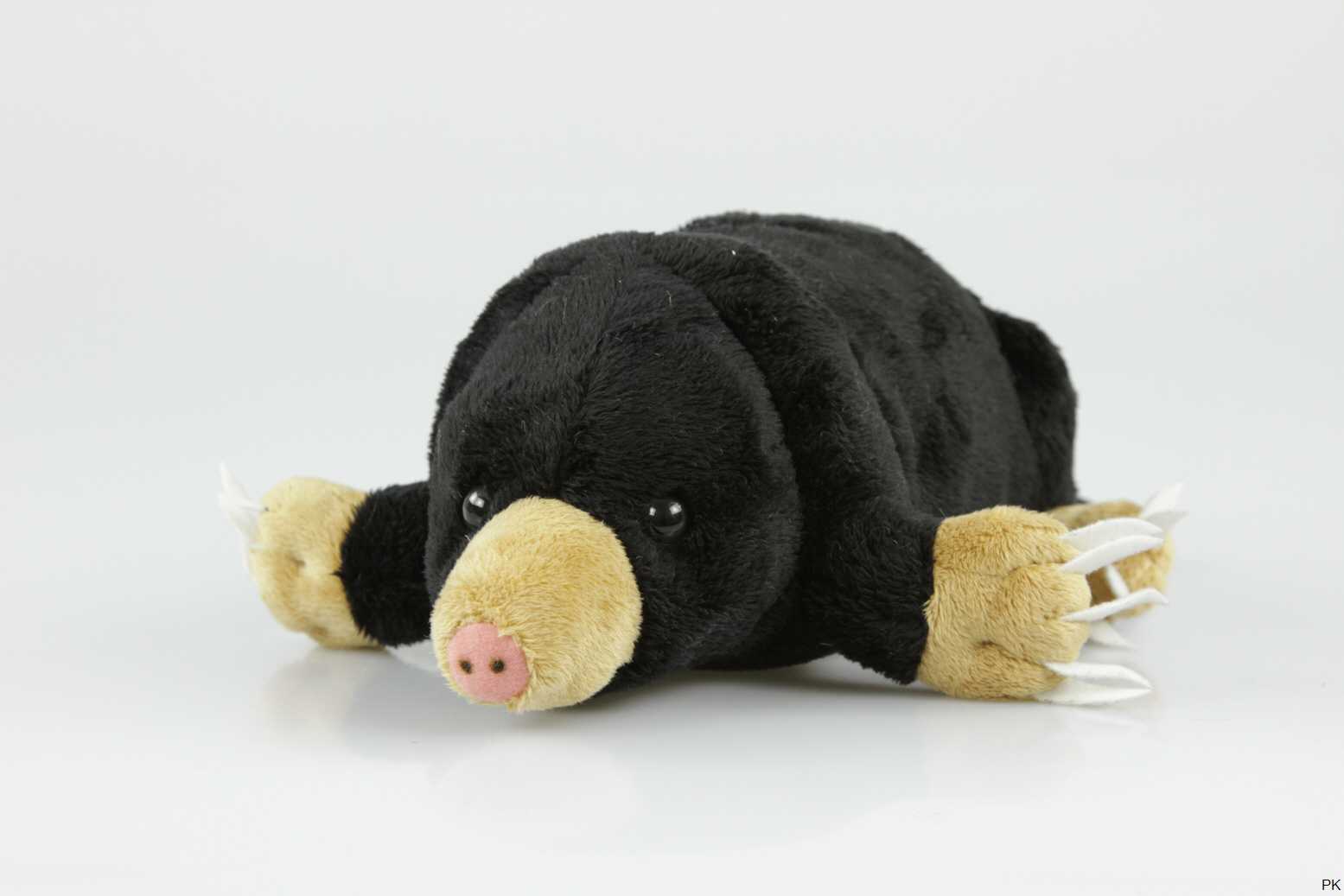 Das Fell des Stofftiers Maulwurf ist schwarz. Die Füße des Plüsch Maulwurfs sind farblich beige abgesetzt, ebenso die Schnauze, die Nasenspitze ist roséfarben. Der kuschelige Maulwurf hat zwei schwarze Knopfaugen.