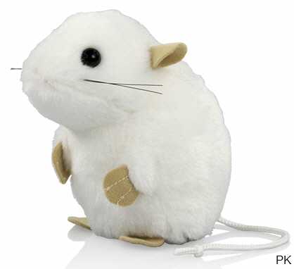 Das Stofftier Maus ist weiß gefärbt, die Gliedmaßen, und Ohren sind hellbraun gefärbt.