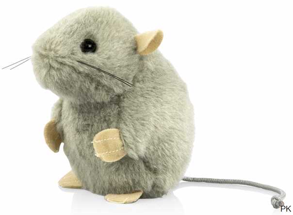 Das Stofftier Maus ist grau gefärbt, die Gliedmaßen, und Ohren sind hellbraun gefärbt.
