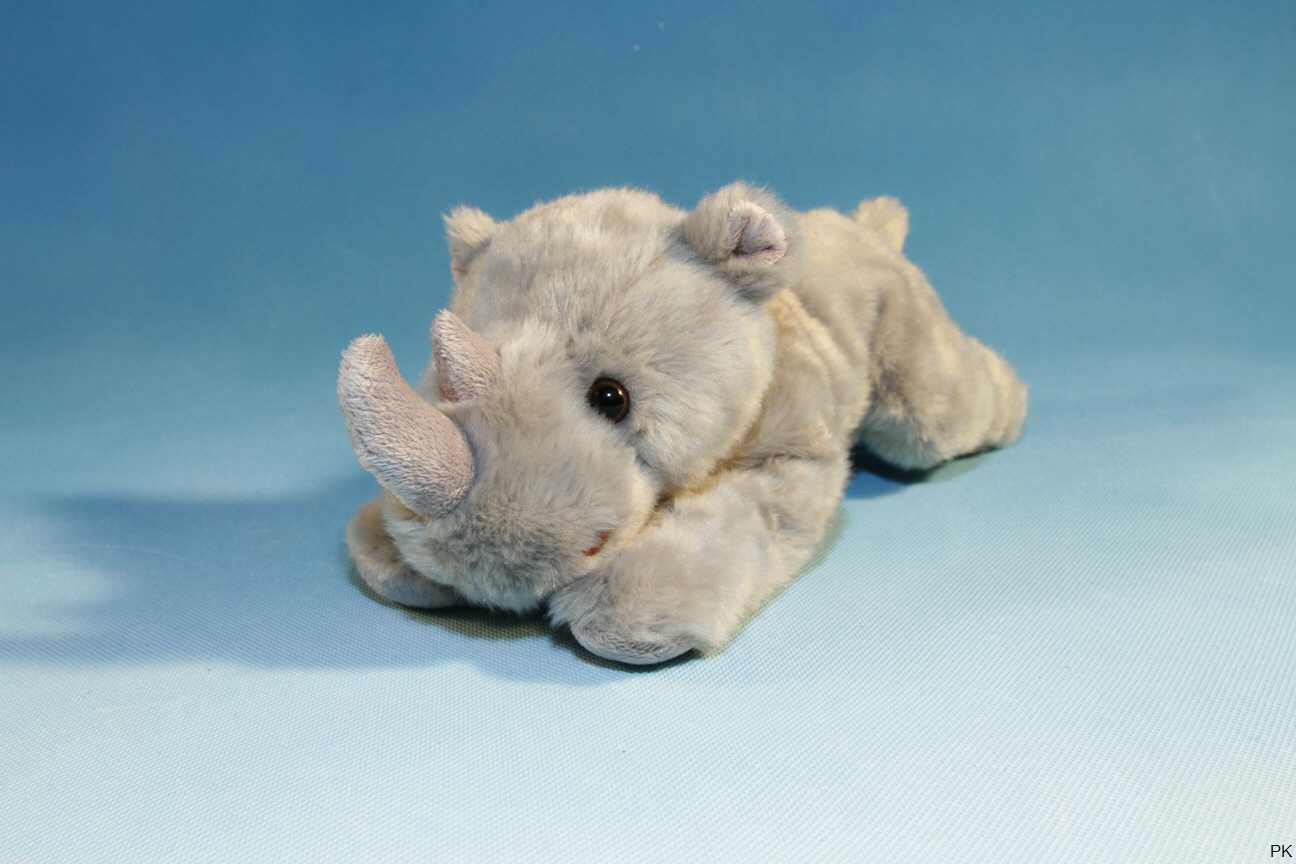 Das Fell des Stofftiers Nashorn ist grau gefärbt, die Knopf-Augen sind schwarz.
