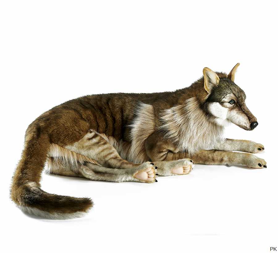 Plüschtier Wolf ähnelt einem großen Haushund, der Rumpf ist jedoch länger, der Brustkorb höher und schmaler.